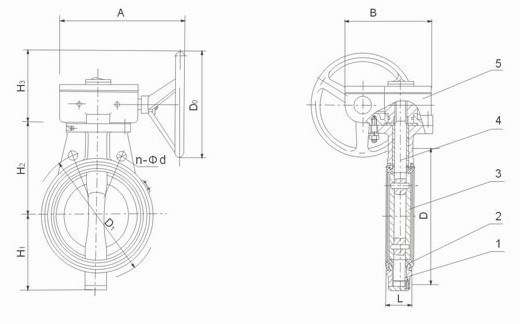 部件列表:1、阀体 2、阀座 3、蝶板 4、阀杆 5、蜗轮装置